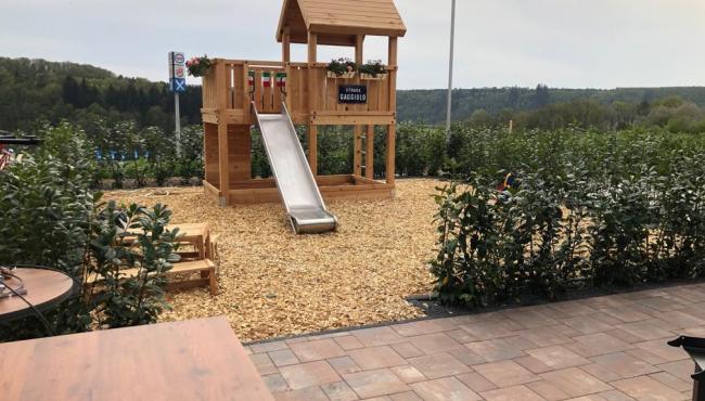Außenanlage mit Terrasse und Spielplatz für L‘Osteria Wertheim